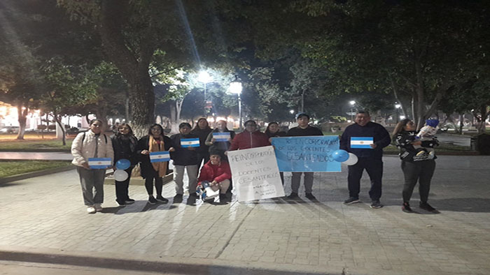En la ciudad de Embarcación, ubicada en el departamento General José de San Martín de la provincia de Salta, se desarrolla uno de los principales focos de resistencia docente contra las políticas de ajuste del gobierno provincial. La situación se intensificó drásticamente en enero cuando el gobernador Gustavo Sáenz, junto a la ministra de Educación Cristina Fiore, cesanteó a 127 docentes que habían participado en diversas medidas de protesta.