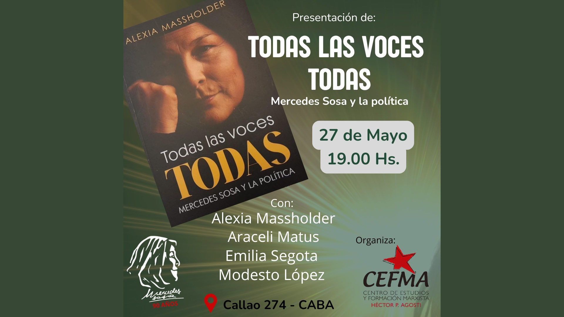El martes 27 de mayo a las 19 horas en la sede del Cefma, Avenida Callao 274 en la Ciudad de Buenos Aires, se presentará el libro de Alexia Massholder, Todas las voces todas. Mercedes Sosa y la política, con la presencia de su autora y la participación de Araceli Matus, Emilia Segota y Modesto López.