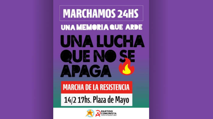 “Una memoria que arde. Una lucha que no se apaga”, es la convocatoria que tiene la marcha que comienza hoy a la hora 17 en Plaza de Mayo. “Como PC y CoNaT, nos comprometemos a decir presente, aportando y denunciando a este gobierno que lamentablemente viene avanzando contra nuestros derechos”, puntualizó la secretaria de Derechos Humanos de la CTA bonaerense, Lorena Giorgetti.