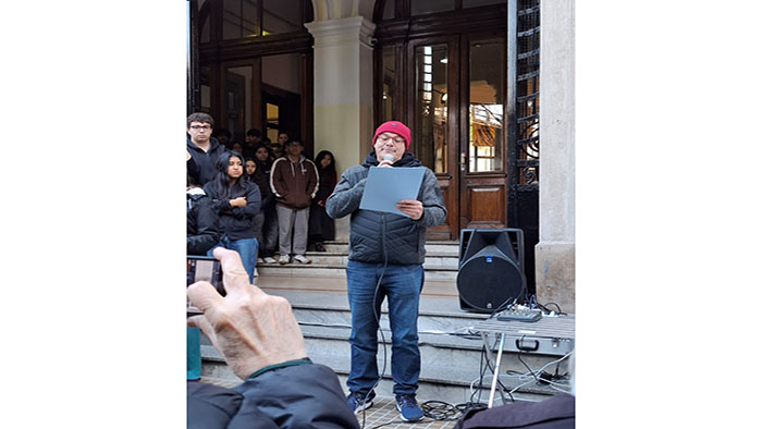 Durante el acto las autoridades de la escuela se dirigieron a los presentes, tras lo que lo hicieron las profesoras que junto a alumnos llevaron adelante un exhaustivo trabajo de investigación que permitió confeccionar la lista que hoy se refleja en las Baldosas, en una tarea fundamental que aporta a apuntalar la memoria histórica. Después se sucedieron mensajes; entre ellos el de una representante del Llamamiento Argentino Judío, Eugenia Kwater, quien reflexionó acerca del vínculo que une la lucha de las trabajadoras de la educación a quienes se rindió homenaje con la que ahora mismo libra el pueblo palestino.