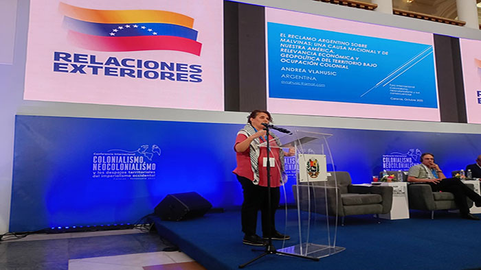Durante el primer día de la conferencia, organizada por el Ministerio del Poder Popular para las Relaciones Exteriores de Venezuela, Vlahusic fue expositora en el panel “Problemas territoriales derivados del colonialismo”, coordinado por Yuri Pimentel, viceministro para África de la Cancillería. En su intervención presentó la ponencia “El reclamo argentino sobre Malvinas: una causa nacional y de Nuestra América. Relevancia económica y geopolítica del territorio bajo ocupación colonial”. El panel también contó con las participaciones de Juma Rifal (Palestina), Mohamed Zrug (Frente Polisario de la República Saharaui), Agustín Lao Montes (Puerto Rico), Ruy Díaz Díaz (Honduras), Gilberto López y Rivas (México) y Samuel Moncada (embajador de Venezuela ante las Naciones Unidas).