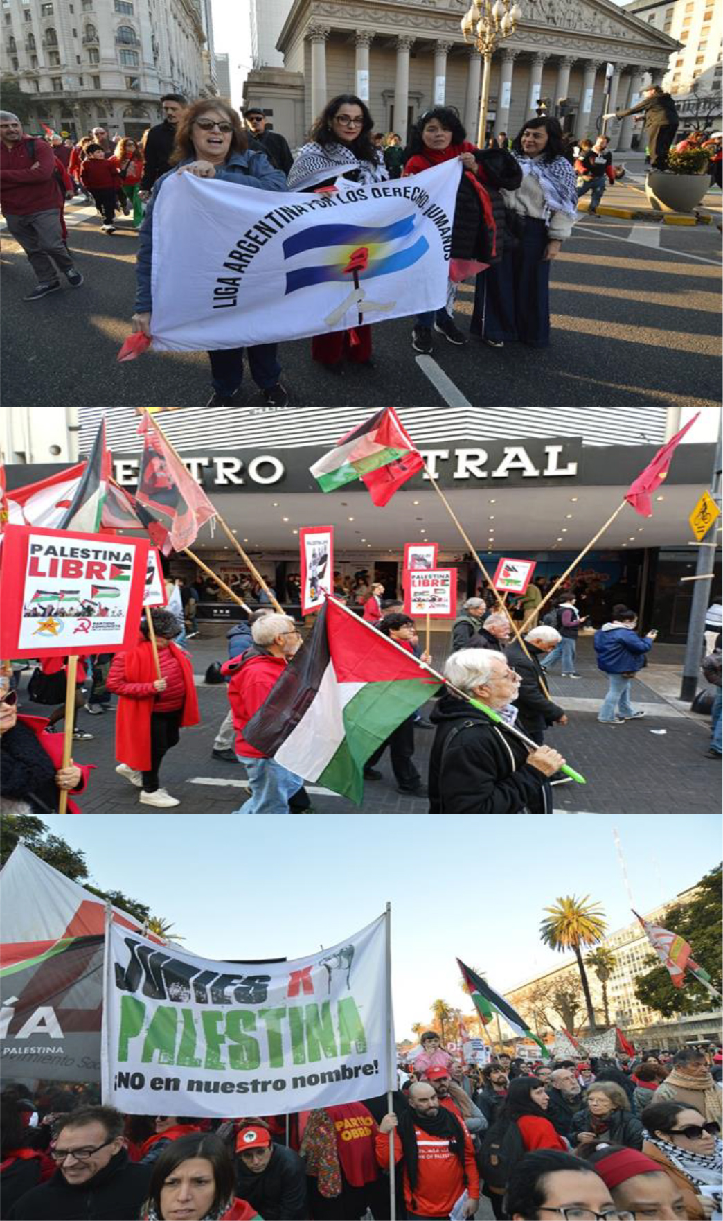 En la capital de Argentina, al llegar a Plaza de Mayo se leyó el documento del Comité Argentino de Solidaridad con el Pueblo Palestino en el que se hace público el repudio al alineamiento del gobierno que encabeza Javier Milei “con el sionismo y el imperialismo”, así como a la persecución contra quienes se solidarizan con el pueblo palestino, al tiempo que se exigió “Fuera Mekorot de la Argentina”.