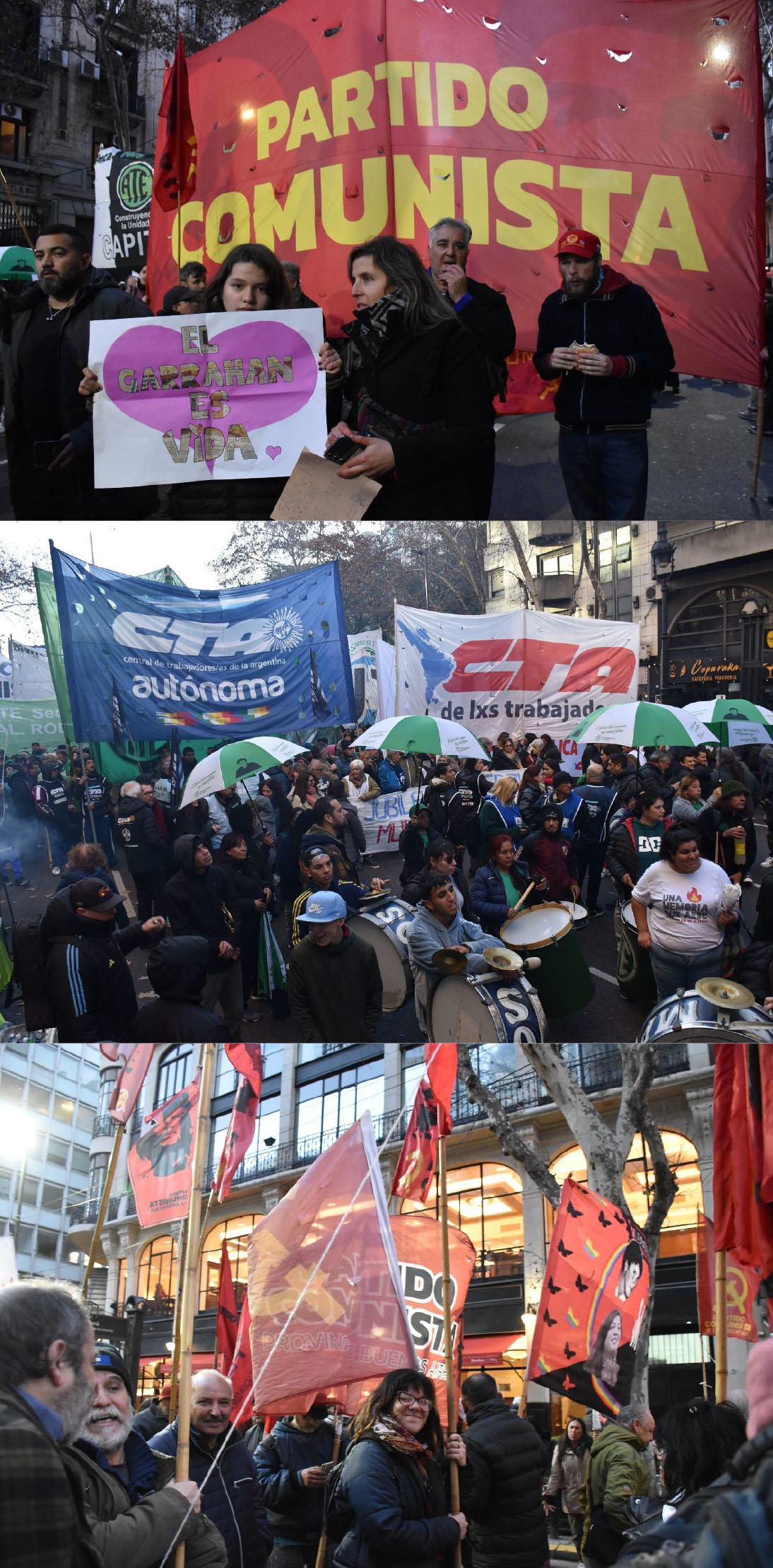 Convocada por ATE y por la Asociación de Profesionales y Técnicos del Garrahan, la movilización en Capital contó con la participación de ambas CTA y del Frente de Lucha por la Soberanía, el Trabajo Digno y los Salarios Justos. Entre otros sindicatos estuvieron presentes la UTE, la CICOP, la Unión Obrera Metalúrgica, Camioneros, la Asociación de Pilotos de Líneas Aéreas y la Federación Argentina de Trabajadores de Prensa. También se sumaron diversas organizaciones sociales, estudiantiles y políticas. La manifestación, que se extendió por varias cuadras del centro porteño, demostró una vez más que cuando se organiza una convocatoria masiva para defender en unidad los derechos de nuestro pueblo, el ministerio de seguridad se guarda el protocolo represivo que saca a relucir con el despliegue conjunto de la policía, la gendarmería y la prefectura para pegarles a lxs jubilados.