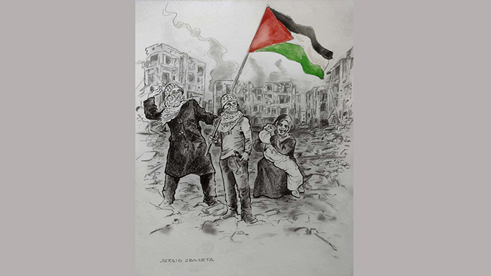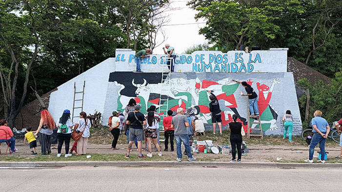 Esta es la frase que se lee en un mural realizado en Florencia Varela con la participación del PC local, para alertar sobre la masacre a la que el Estado de Israel somete al pueblo palestino.