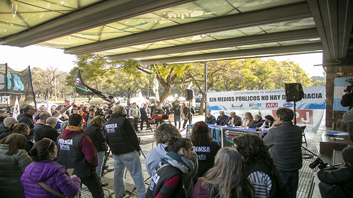 La iniciativa, que tuvo lugar en la entrada de la TV Pública, fue organizada en unidad con el Sindicato Argentino de Televisión (Satsaid), el Sindicato Argentino de Locutores y Comunicadores (Salco), y la Asociación del Personal Jerarquizado (APJ).