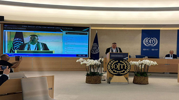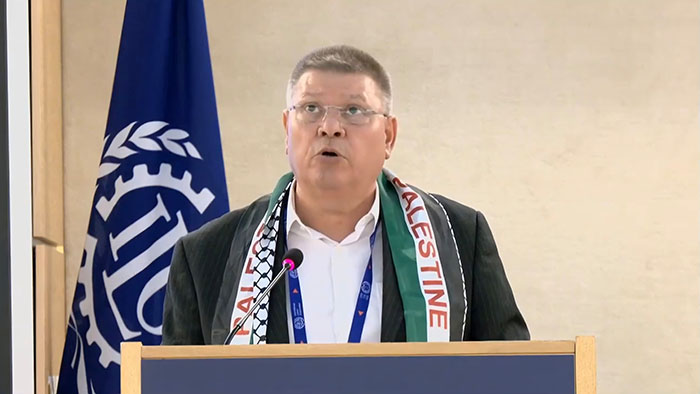 En este sentido, condenó a Israel y su ataque al pueblo palestino: "El genocidio por parte del asesino Estado de Israel continúa sin cesar con el apoyo o tolerancia de Estados Unidos, la Unión Europea y sus aliados. Los derechos de los trabajadores palestinos han sido brutalmente violados durante décadas". Asimismo, subrayó la necesidad de que el informe del Director General sobre la situación de los trabajadores en la Palestina ocupada “no sea solo una descripción”, sino que también recomiende “acciones efectivas para quienes sufren las consecuencias de la ocupación y el apartheid de Israel”. A su vez, el titular de la FSM, valoró la resolución de la OIT sobre Palestina, afirmando que "la elevación del estatus de Palestina de Movimiento de Liberación al de Estado observador no miembro es lo mínimo que la OIT puede decidir".